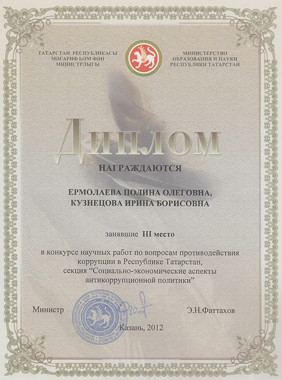 Сегодня в Министерстве образования Республики Татарстан состоялось награждение заведующего отделом качественных исследований, Центра перспективных экономических исследований Академии наук Республики Татарстан, к.социол.н. Полина Ермолаева за победу в конкурсе научных работ вопросам противодействия коррупции в Республике Татарстан. Данная работа заняла третье место.