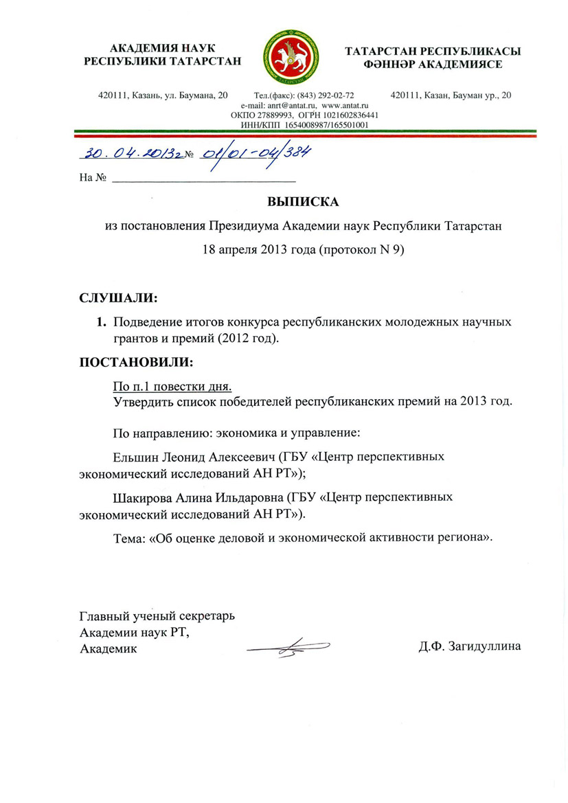 Коллектив Центра перспективных экономических исследований поздравляет заведующего отделом макроисследований и экономики роста, к.э.н., доцента Леонида Ельшина и научного сотрудника отдела макроисследований и экономики роста, аспирантку Алину Шакирову с победой в конкурсе республиканских молодежных научных грантов и премий (2012г.) По направлению: экономика и управление, по теме: "Оценка деловой и экономической активности региона".
