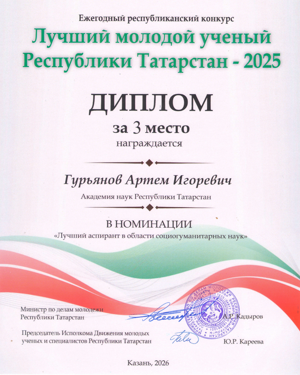 Сотрудник Центра перспективных экономических исследований Академии наук Республики Татарстан и аспирант первого курса обучения Гурьянов Артем Игоревич занял 3 место на ежегодном республиканском конкурсе «Лучший молодой ученый Республики Татарстан – 2025» в номинации «Лучший аспирант в области социогуманитарных наук». От всей души поздравляем Артема Игоревича с заслуженной наградой и желаем неугасаемого научного вдохновения и новых побед!