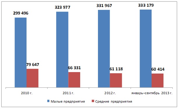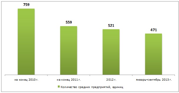 В предыдущем обзоре предпринимательства в республике мы уже отмечали, что в экономике действуют силы, препятствующие росту численности средних предприятий. [2] За январь-сентябрь т.г. ситуация не изменилась – если в 2012 году число средних предприятий составляло 521 ед., то сейчас их насчитывается 471, или 90,4%. Всего же с 2011 года их численность сократилась на 38%.