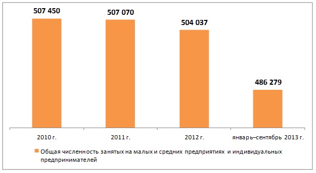 В январе-сентябре 2013 года сократилась общая численность занятых в предпринимательском секторе. Если в 2012 году их насчитывалось 504 тыс.чел., то за отчетный период – 486 тыс.чел. Это также долгосрочная тенденция – с 2010 года данный показатель сократился на 4%.