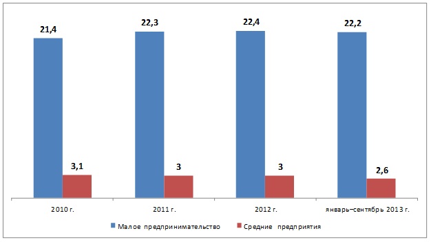 Основной вклад в ВРП в предпринимательском секторе вносит малое предпринимательство. В январе-сентябре 2013 года их доля в производстве ВРП республики составила 22,2%, а средних предприятий – 2,6%. Следует отметить, что общая доля вклада предпринимательского сектора в производство добавленной стоимости остается достаточно стабильным, составляя 24-25%. Существенно нарастить эту долю за последние четыре года пока не удается.