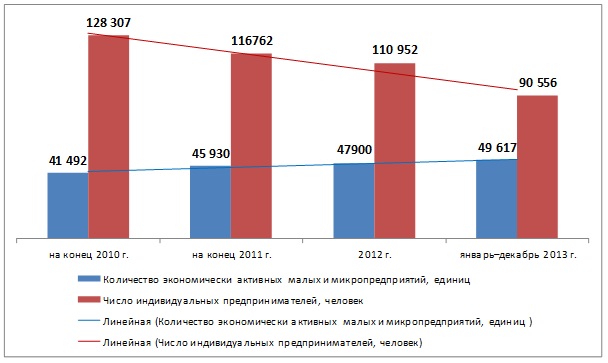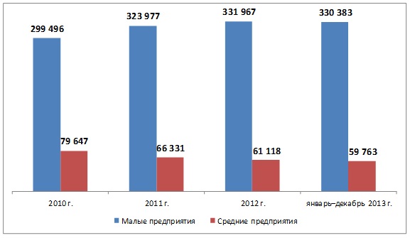 В январе-декабре 2013 года количество малых и микропредприятий возросло на 4% по сравнению с 2012 годом и составило 49,6 тыс.ед. При этом количество средних предприятий снизилось за указанный период на 8%, составив 478 ед. Падение наблюдается и в численности индивидуальных предприятий - за 2013 год этот показатель снизился на 18%, при этом численность глав крестьянских хозяйств сократилась на 31%. [1]