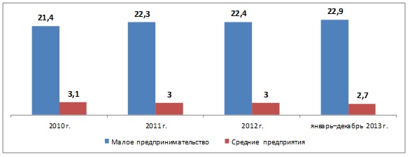 Доля малых предприятий в ВРП в январе-декабре 2013 года составила 22,9%, а средних предприятий - 2,7%. За последние четыре года общая доля малых и средних предприятий практически стагнирует. Если в 2010 году данный показатель составлял 24,5%, то в 2013 году - 25,6%.