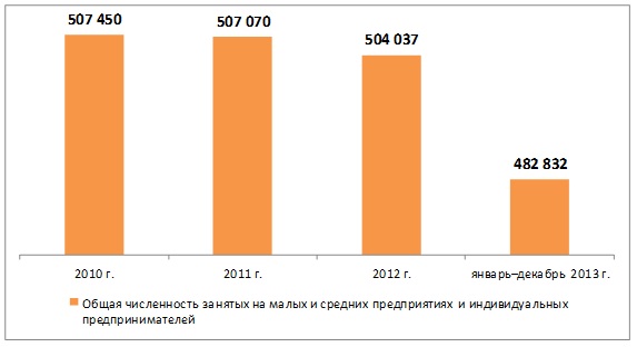 Общая численность занятых на малых и средних предприятиях, а также индивидуальных предпринимателей в январе-декабре 2013 года составила 482,8 тыс.чел., что на 4,2% меньше, чем в 2012 году. Численность занятых на малых предприятиях снизилась на 0,5%, на средних предприятиях - на 2,2%, число индивидуальных предпринимателей сократилось на 16,5%.