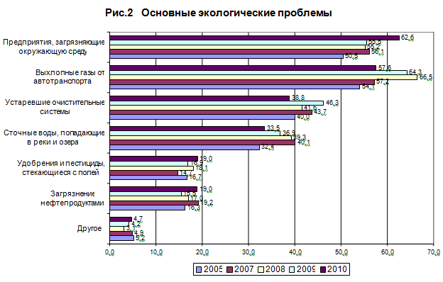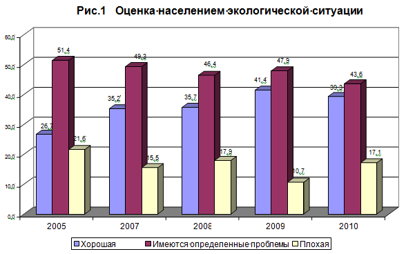 Социологические исследования, проведенные нами за последние пять лет позволяют утверждать о том, что население республики в большинстве своем не удовлетворено состоянием окружающей среды – всего лишь 39,3% участников опроса выразили удовлетворенность состоянием экологической ситуации в своем городе, селе. Заметим, что этот показатель даже несколько ниже прошлогоднего – 41,4%, так как экстремальные погодные условия текущего года заставили несколько по-другому посмотреть на проблему экологии не только ученых, но и простых людей. Кроме этого, в 2010 году увеличилась доля респондентов, оценивающих экологическую ситуацию как плохую – 17,1% (к примеру, в 2009 г. доля таких респондентов составила 10,7%). Если рассматривать проблему в пятилетней динамике, то население дает наиболее благоприятную оценку экологической ситуации в кризисном 2009 году, что можно было бы объяснить некоторым снижением деловой активности, в том числе и в промышленном производстве (Рис.1).