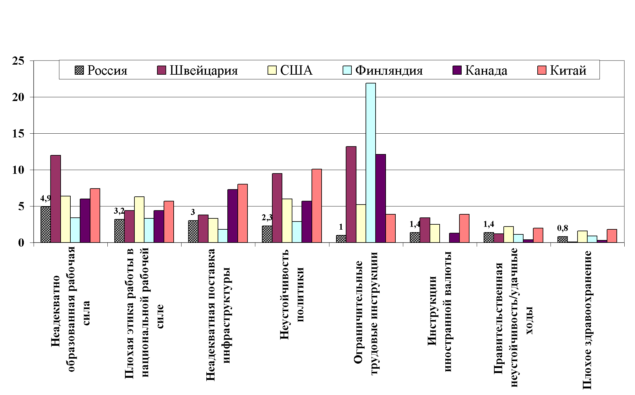 Данные еще раз подтверждают, что бичем российской экономики, что признается и на мировом уровне, является коррупция и различного рода преступления. По большинству других факторов Россия испытывает такие же проблемы, что и другие развитые страны мира, например, по доступу к финансовым ресурсам, налоговой отчетности, бюрократическим барьерам и другим. Наименьшее негативное воздействие на конкурентоспособность России по сравнению с выбранными в данной статье для анализа странам мы имеем по ограничениям на рынке труда и трудоустройства, что также корреллируется с данными таблицы 2.