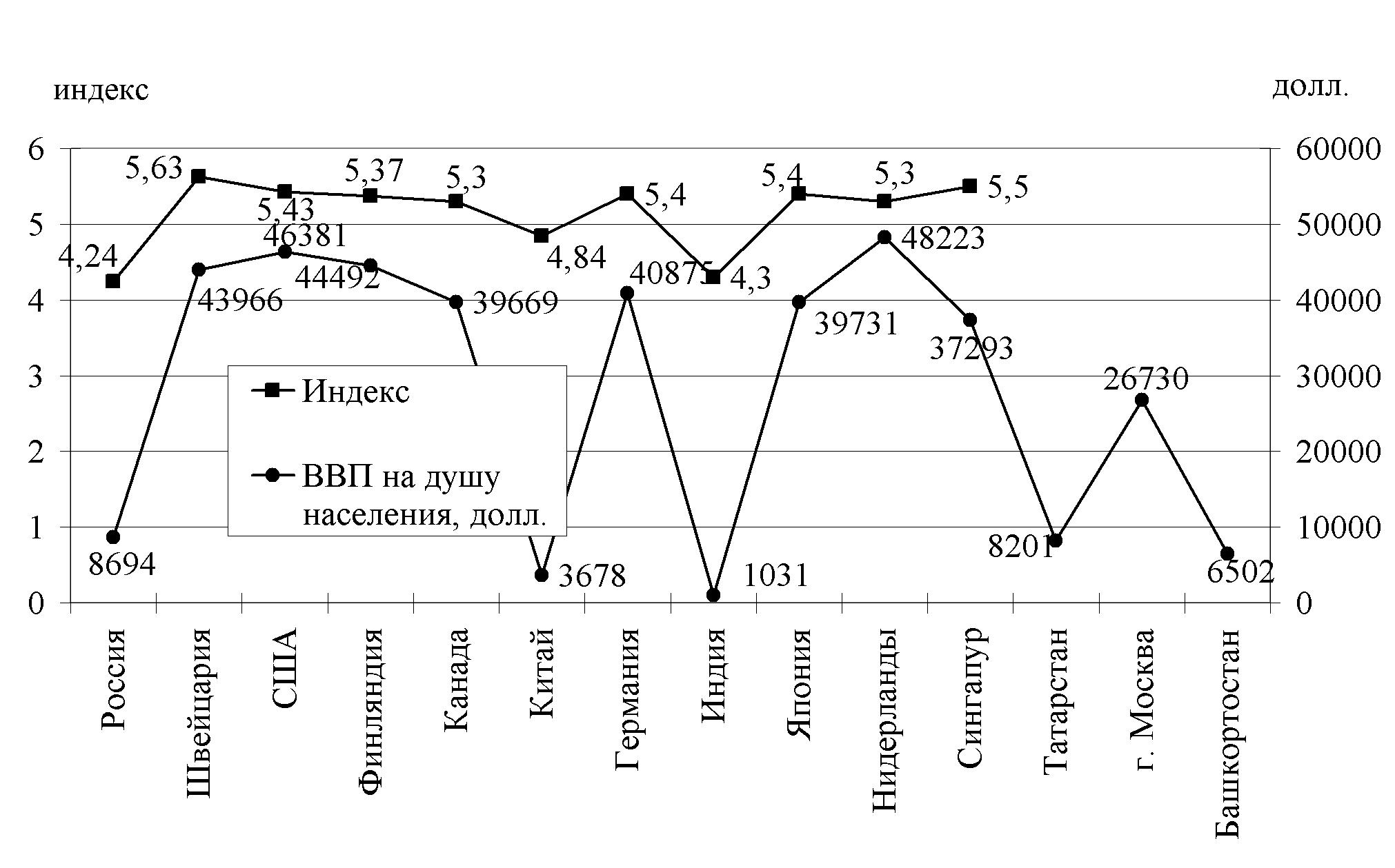 На рисунке 3 представлен индекс глобальной конкурентоспособности во взаимосвязи с величиной ВВП на душу населения в разрезе некоторых стран мира, характеризующий в большей степени и подтверждающий значительное влияние микроэкономических факторов на конкурентоспособность национальных экономик.
