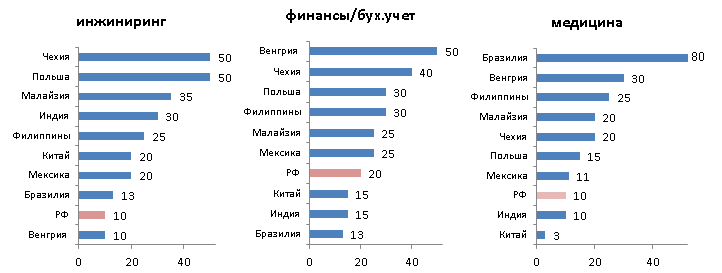 Большинство опрошенных представителей бизнеса считают, что вузы не предоставляют необходимых навыков в сфере управления. Кроме этого, у России довольно низкие позиции в рейтинге по показателям научной активности. Все это приводит к тому, что только небольшая часть выпускников российских вузов является достаточно квалифицированной для трудоустройства в международных компаниях (рисунок 2).