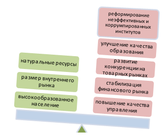 На основе выводов доклада была предложена формула экономических преобразований «3+5», отображающая три основных конкурентных преимущества России и пять главных вызовов, препятствующих ее развитию (рисунок 1).